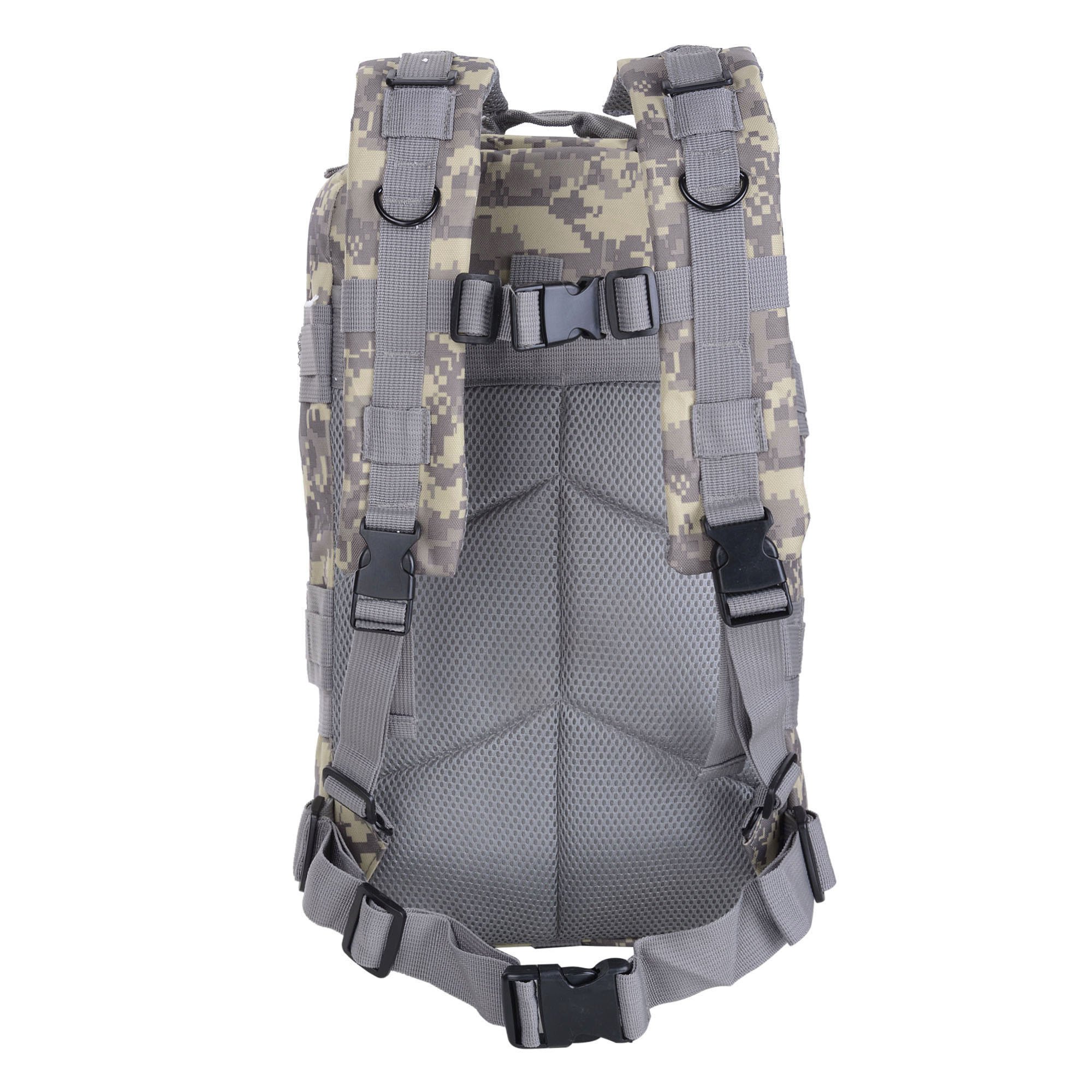 • Large Capacity &  Multiple Pockets - 17" x 10" x 8" ACU Camouflage Military  Molle Tactical Backpack with 28 L large capacity; features 2 zipped large  compartments with 2 front pockets & inner pockets; better organize and  hold all your outdoor gears in a bag; ideal for mountaineering; hiking;  camping; travel; jungle adventure and other sports activities