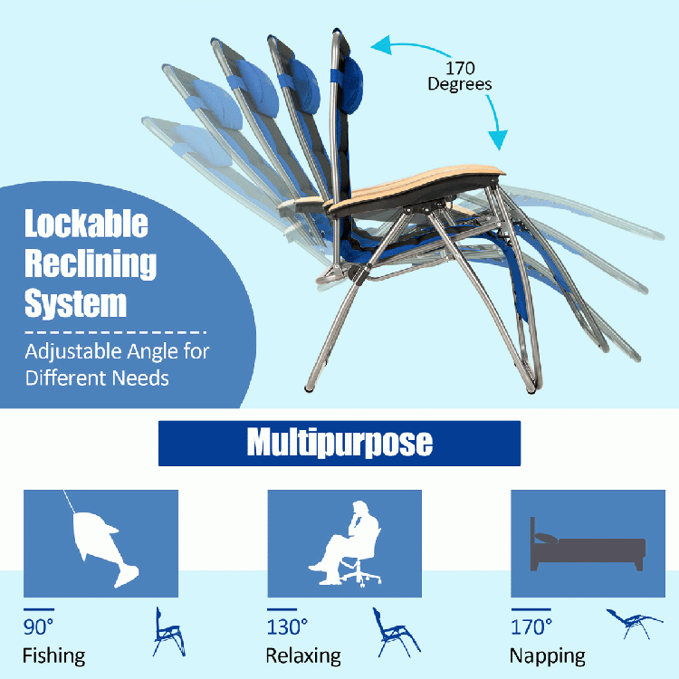 1.Adjustable reclining angle for different purposes like fishing, relaxing, napping